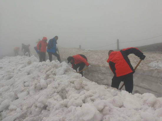 通往主峰的道路蜿蜒崎嶇,路邊的山體嶙峋陡峭,厚達4—5米的積雪綿延10多公里,陡峭的山體不時有碎石滾落,面對如此艱巨的工程,南景區(qū)員工迎難而上,勇往直前,再一次發(fā)揚了能吃苦、不怕累、打勝仗的決心和意志。員工們起早貪黑、櫛風沐雨,短短一周的時間里,10多公里的積雪在清雪車的轟鳴中被一層層的剝離清理。5月11日,通往主峰天池停車場的道路全線貫通。