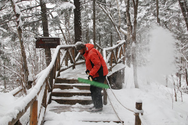 大年初一,長白山普降瑞雪,公路積雪厚度近50厘米,服務(wù)先鋒黨小組以雪為令,小組中以黨員為骨干的清雪防滑隊(duì),凌晨就頂著星辰和寒風(fēng)開始清雪除障作業(yè),保證道路在山門開放前安全暢通達(dá)到開放要求,大家克服凜冽的寒風(fēng)完成1800米棧道積雪清理工作。