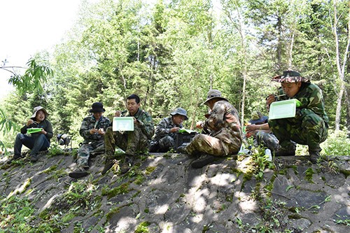 每天清晨,隊(duì)員們都會像往常一樣,早早的到達(dá)預(yù)定路段開始工作。他們不但要頂著烈日的暴曬和山雨的洗禮,還要經(jīng)受著蚊蟲的叮咬,長長的毒針刺進(jìn)了隊(duì)員們的皮膚,中毒后的眼部立即腫脹成了一條細(xì)縫,叮咬過的耳部更是癢痛難止。面對這樣的艱苦條件,卻沒有一個人喊累叫苦,選擇退出。