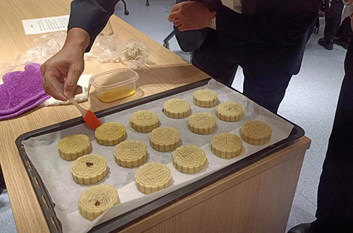 活動(dòng)現(xiàn)場(chǎng),桌上早已備好紅豆沙餡、面粉、糖漿、花生油等食材以及電子秤、模具等工具。大家圍成一桌,分工合作,相互配合,一步步做好揉搓面皮、捏皮成型、放入餡料等工序,最后通過(guò)模具壓制成型,制作出了造型美觀的月餅?;顒?dòng)現(xiàn)場(chǎng)充滿(mǎn)了歡聲笑語(yǔ),一派熱鬧非凡、其樂(lè)融融的節(jié)前景象。